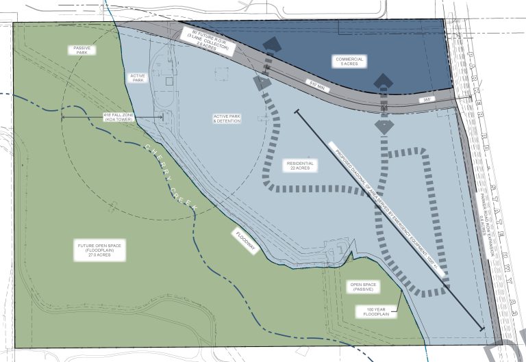 A 57-acre parcel of land located on Parker Rd behind Flat Acres Marketplace in Parker. The parcel is suitable for high-density residential and commercial. 6+ acres are set aside as retail space, leaving 17+ acres of building space.