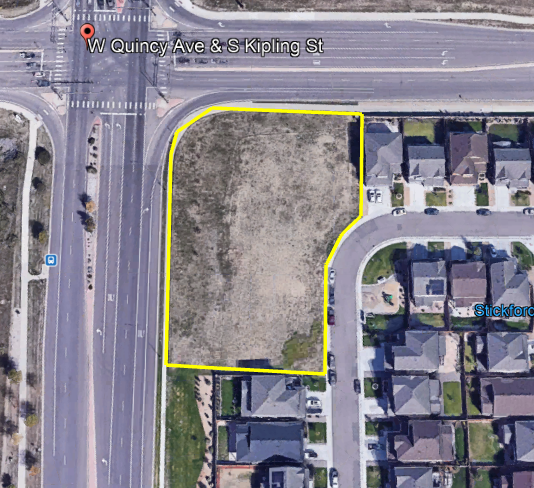 Corner commercial 1.5 acre pad at the intersection of Kipling and Quincy in Littleton CO. Sold to Dazbog 12.2021